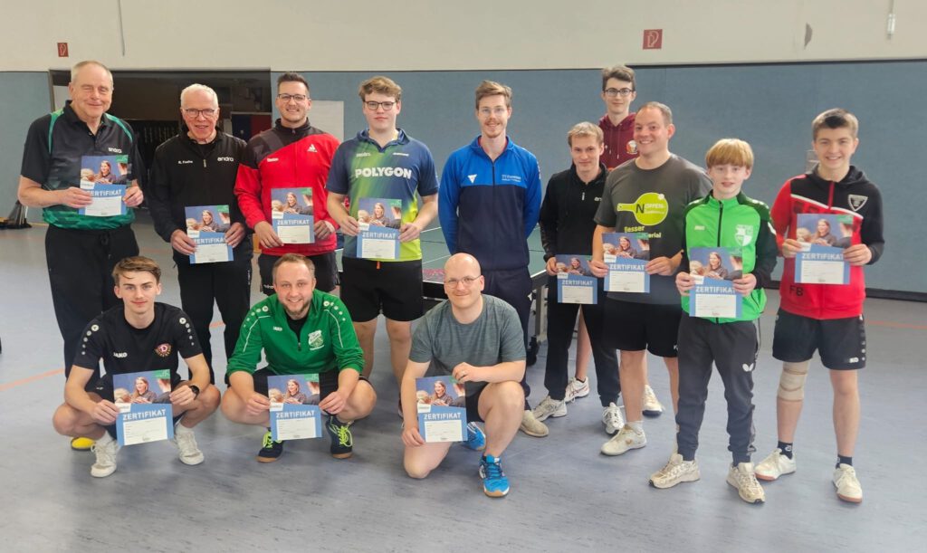 Alle Teilnehmer des StarTTer-Lehrgangs in Burbach auf einen Blick, mit ihren Teilnehmerbescheinigungen. In der Bildmitte hinten (im blauen Trainingsanzug) der Ausbilder des WTTV, Johannes Linnenkohl.